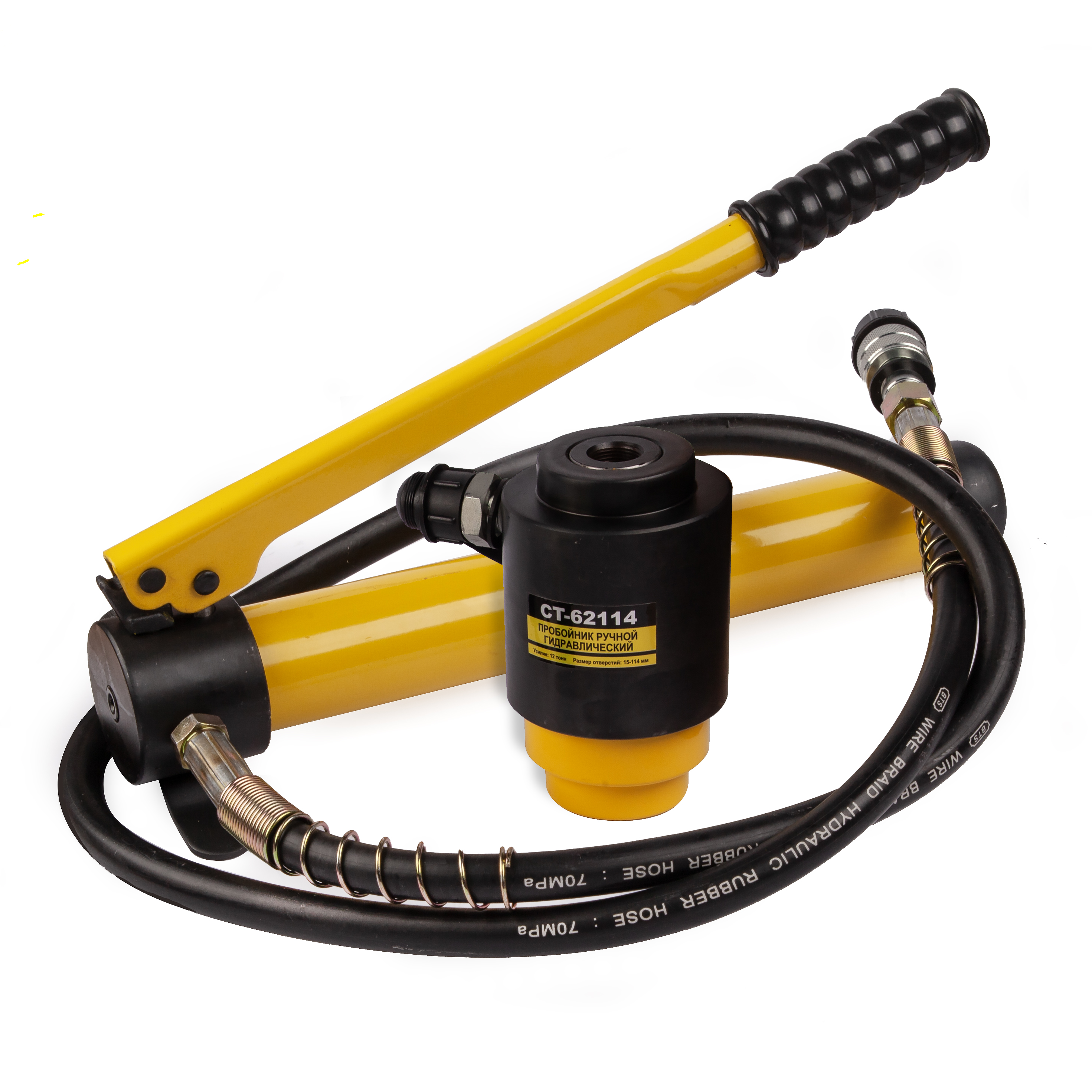 Пробойник ручной гидравлический 63-114 мм., 13 т., с насосом Car-Tool CT-62114 ? профессиональный инструмент для вырубки отверстий в листовом металле. Высокое усилие и точность обеспечивают безопасное и быстрое выполнение работ на стройплощадке или в автосервисе.