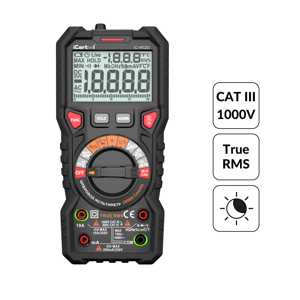 iCartool IC-M120 - профессиональный цифровой мультиметр с высокой точностью и надежностью измерений. Имеет разрядность 20 000 отсчетов и высокий рейтинг электробезопасности CAT III 1000V, CAT IV 600V. Работает в режиме TrueRMS. Обладает широким функционалом.