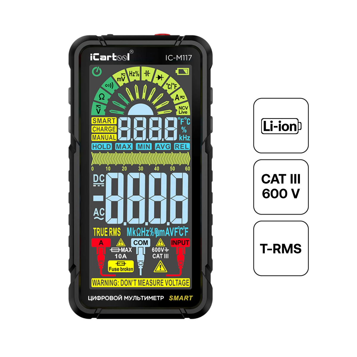 iCartool IC-M117 интеллектуальный цифровой мультиметр с автоматическим выбором режима измерения, большим многофункциональным цветным дисплеем, широким набором дополнительных функций и встроенным Li-ion аккумулятором. Имеет разрядность дисплея 6000 отсчетов и рейтинг электробезопасности CAT III 600V. Аккумуляторный мультиметр работает в режиме TrueRMS.