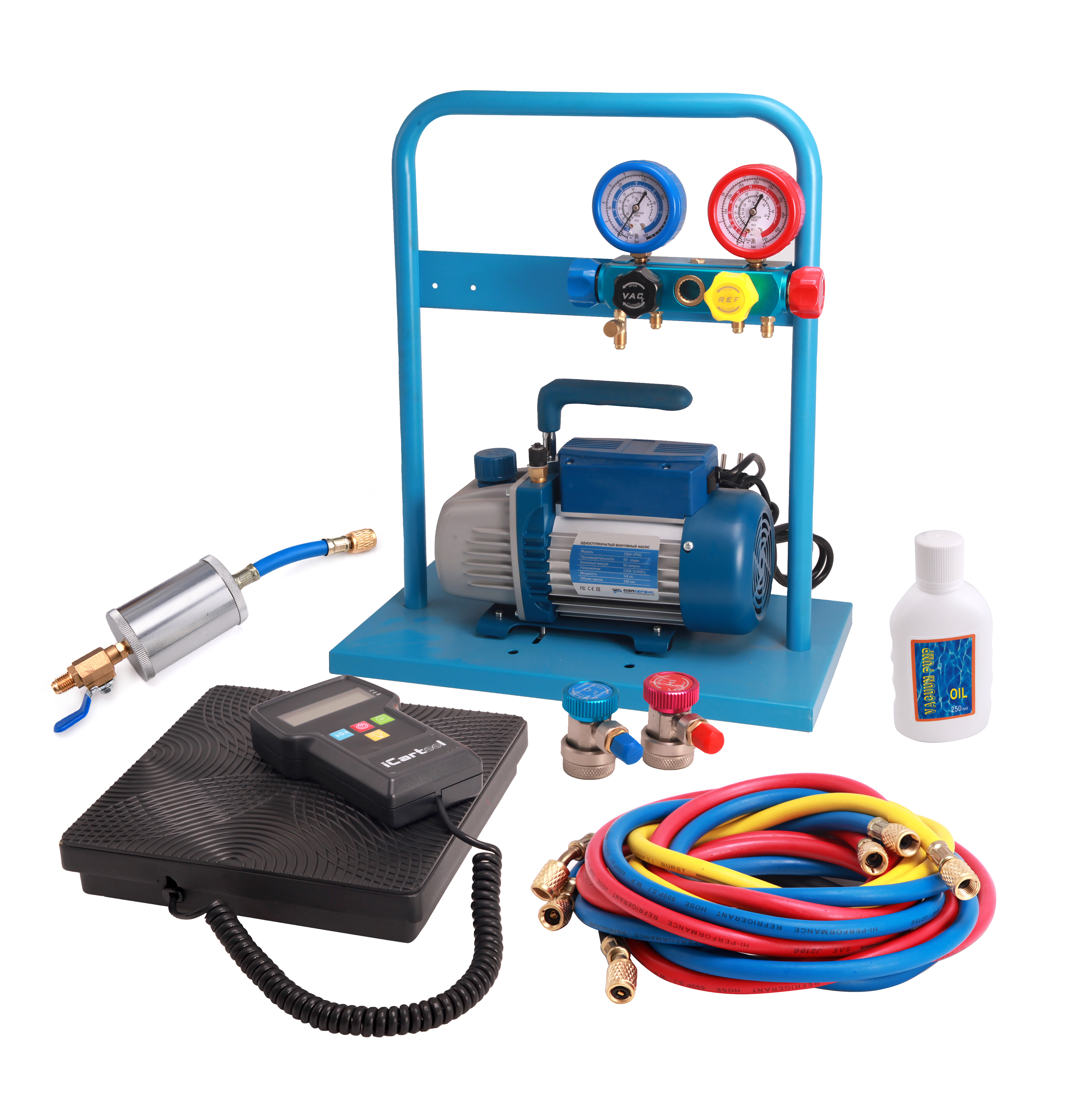 Установка создана на базе 4-х вентильного коллектора и вакуумной помпы. Комплектуется двухступенчатой вакуумной помпой с производительностью 60 л/мин. В комплект также входят заправочные шланги, красный и синий - 3 метра, жёлтый - 1,5 метра и чёрный - 0,5 метра. Для удобства транспортировки и хранения, все компоненты установки установлены на металлической раме.