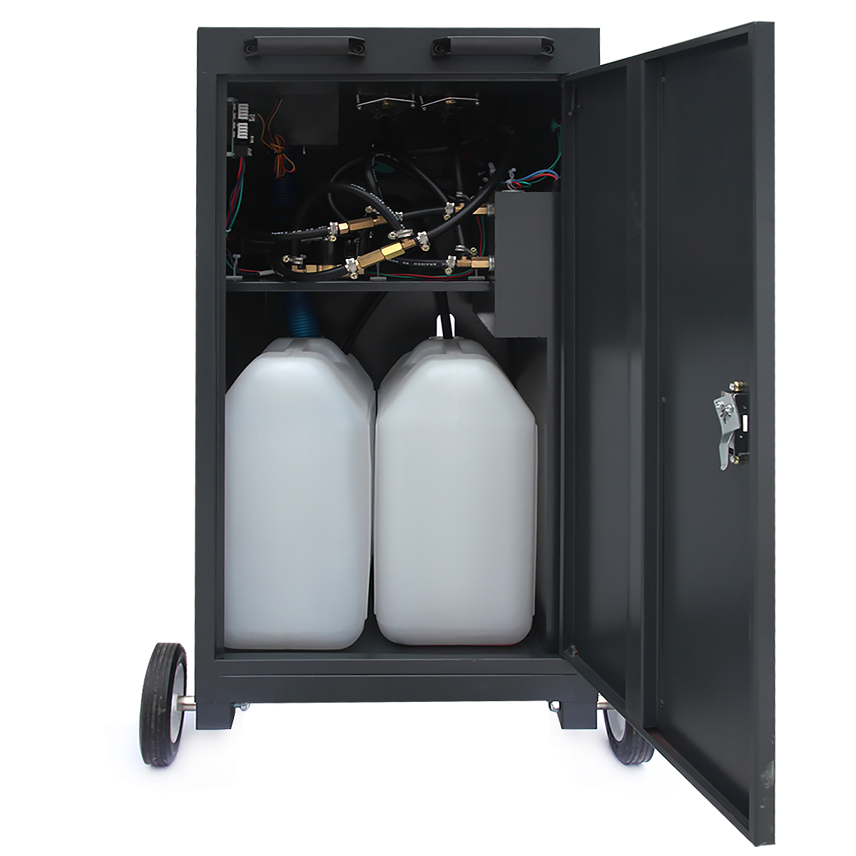 - Полная комплектация: В комплект входят адаптеры, шланги длиной 3,4 метра с быстросъемными соединениями и емкости объемом по 20 литров для новой и отработанной жидкости