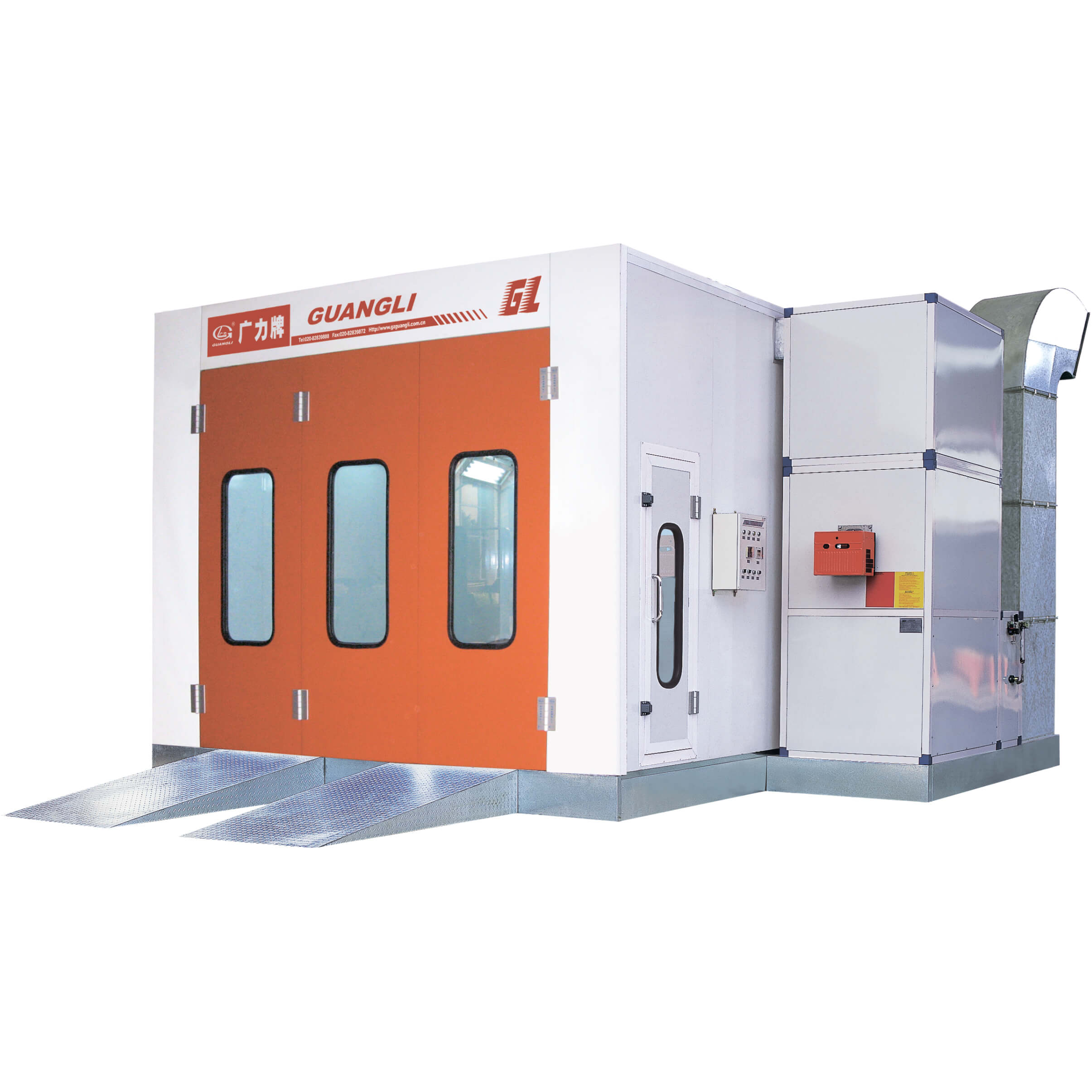 Окрасочно-сушильная камера Guangli GL2 имеет в своей основе металлическое основание высотой 30 см. Напольные решётки выдерживает нагрузку до 600 кг на одно колесо. В стандартном исполнении камера Guangli GL2 комплектуется дизельной горелкой Riello G20 итальянского производства. Мощность горелки составляет 202 кВт, 90 % нагретого воздуха подвергается рециркуляции. Корпус камеры собирается из сэндвич-панелей толщиной 50 мм. В качестве наполнителя используется пенополистирол, опционально можно в качестве наполнителя использовать минеральную вату. Фронтальная дверь покрасочной камеры состоит из 3-х створок, аварийная дверь находится сбоку камеры, она оборудована замком «Антипаника».