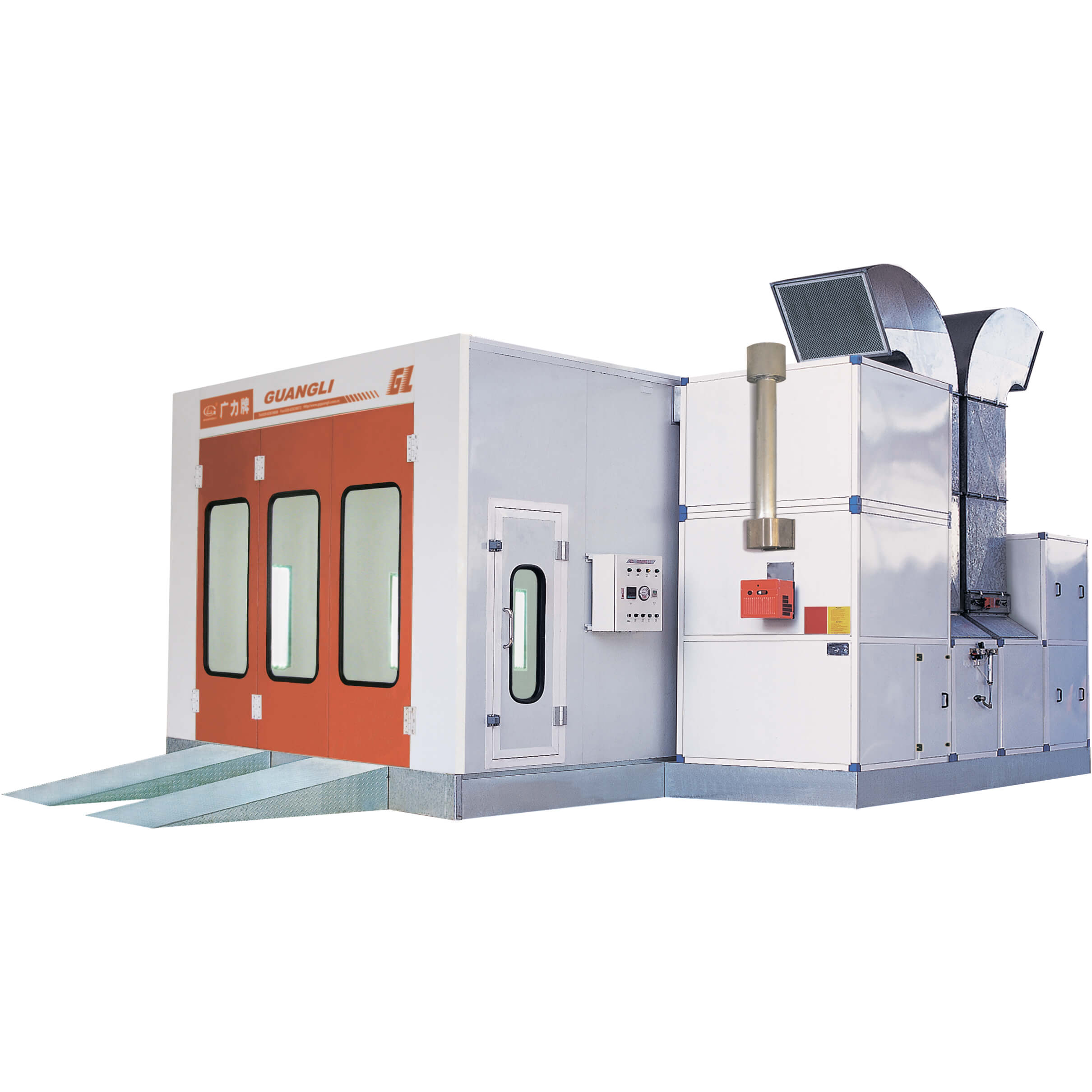 Система фильтров состоит из: потолочного фильтра (степень фильтрации 98 %), напольного фильтра (степень фильтрации 95 %) и фильтра предварительной очистки (степень фильтрации 80 %). Потолочный фильтр состоит из 6-и фильтров, которые монтируются над несущей рамой, выполненной из стали и покрашенной порошковым покрытием. Напольный фильтр состоит из 5-и частей и 2-х выпускных фильтров. Верхнее освещение камеры Guangli GL3 LUX состоит из 10 плафонов, каждый плафон состоит из 4 ламп по 18 Вт. На данной модели используется дополнительное боковое освещение, оно включает в себя 8 плафонов, в каждом по 2 лампы мощностью по 18 Вт каждая. Блок управления и его компоненты импортного производства (Mitsubishi, Omron), они защищены от перегрузки, перегрева, пропадания фазы и от фазовой синхронизации, мотор с Y/Δ запуском. При истечении заданных значений времени, работа Guangli GL3 LUX автоматически прекращается. Покраска происходит при постоянной температуре. Питание камеры осуществляется посредством трёхфазной сети с напряжением 380 В, мощность установки 17 кВт.